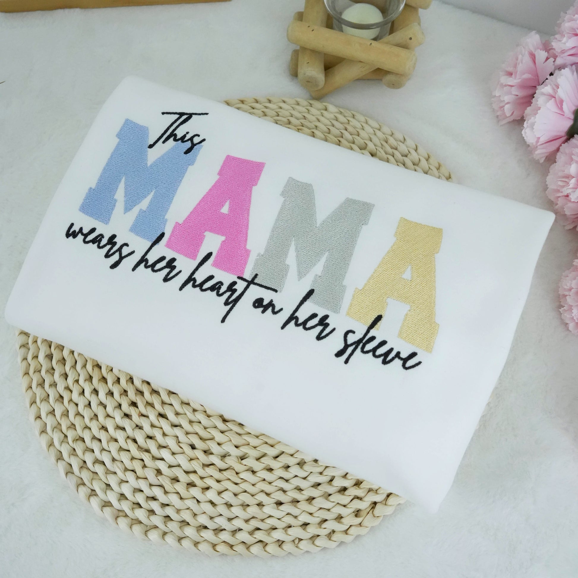 - Heartfelt Embroidery – The phrase “Mom Wears Her Heart On Her Sleeve” is carefully stitched, creating a lovely, tactile design that stands out in any wardrobe.