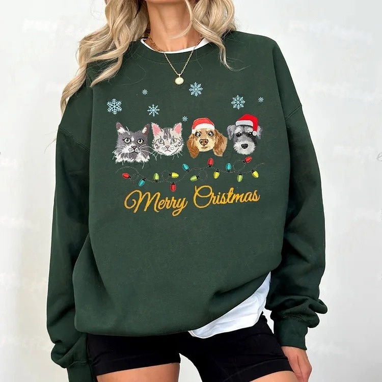 Custom Pet Portrait Christmas Sweatshirt with Snowflake and Christmas Lights Embroidery