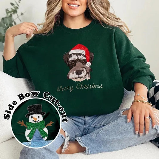Custom Merry Christmas Embroidered Pet Portrait Sweatshirt with Glitter Side Bow Design